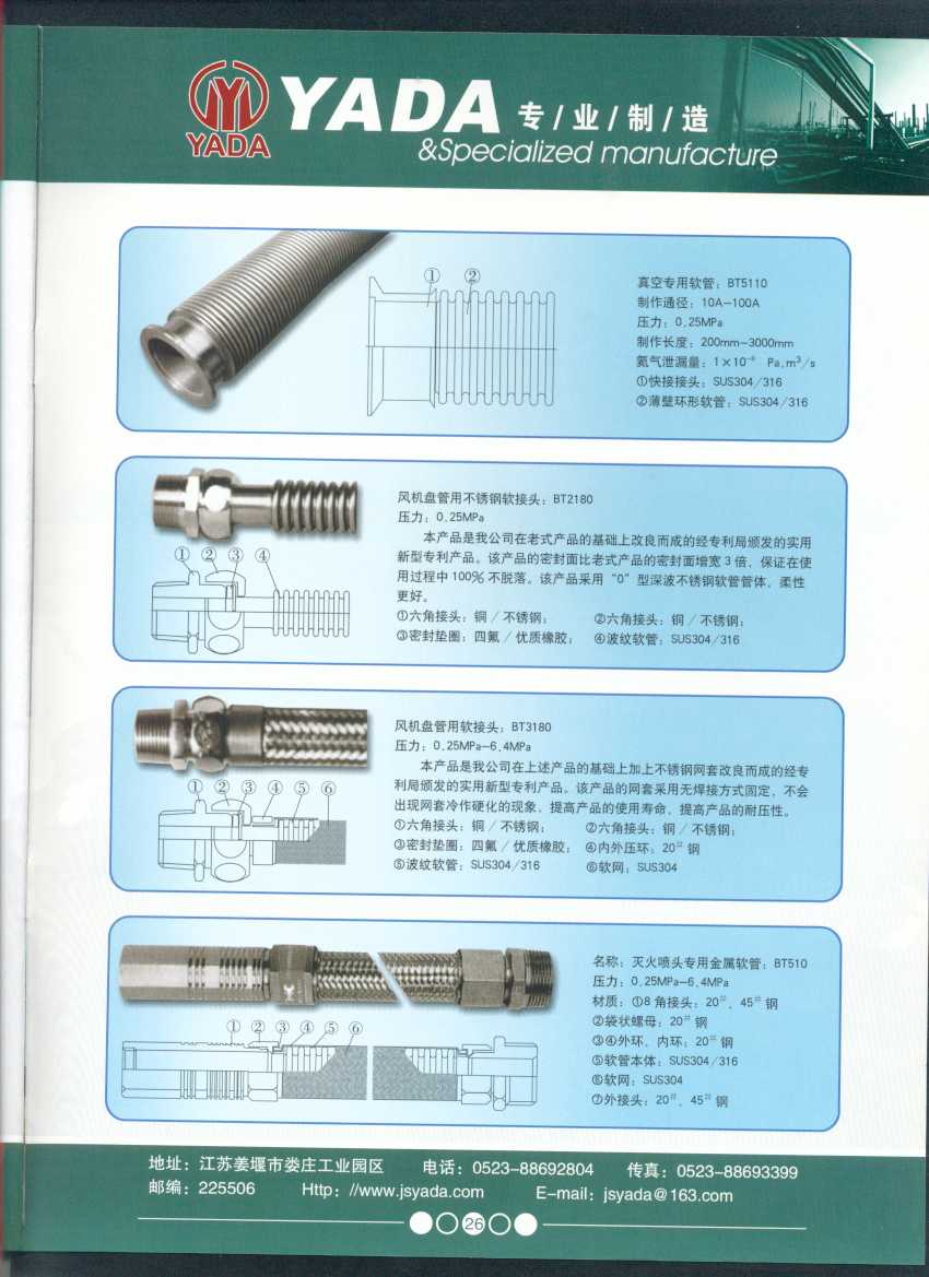 秉天時 籍地利 仰人和 虔誠一個永恒的理念,創(chuàng)新永續(xù).百諾不如一信,亞達(dá)人堅持以信為本,視客戶如同上帝,把對信譽的追求,體現(xiàn)在嚴(yán)格的質(zhì)量控制和完善的客戶服務(wù)上,讓客戶百分之百滿意是亞達(dá)人不變的信念。 本廠系ISO9001質(zhì)量認(rèn)證企業(yè)、計量合格企業(yè)。本廠專業(yè)致力于生產(chǎn)不銹鋼金屬波紋軟管、超高壓、高壓膠管、波紋管補償器(膨脹節(jié))、立式、臥式、冷卻器。本廠產(chǎn)品具有承受壓力高、彎曲半徑小、抗疲勞性能強、使用壽命長等特點。廣泛應(yīng)用于電力、石化、冶金、水泥建材、工程機械、礦山及液壓系統(tǒng)。產(chǎn)品暢銷全國各地。 今日亞達(dá)之成功源自諸多客戶的厚愛,明天的輝煌更離不開您對我的支持與信賴。查看更多>>